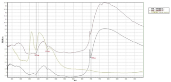 6、紫外-可见分光光度计对样品进行吸收光谱测试,与天然蓝宝石的吸收光谱进行对比,测试样品与天然蓝宝石在387nm、450nm均有吸收峰,但测试样品该处吸收峰的强度比天然蓝宝石明显偏弱;同时在700nm附近出现吸收峰,并以580nm为中心出现吸收宽带,这是天然蓝宝石不具备的。