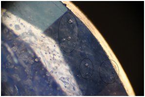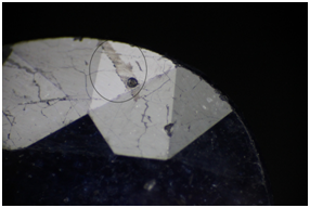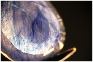 4、显微镜下放大观察,三颗样品表面裂隙发育,颜色沿裂隙富集,部分裂隙中发现有气泡。表面裂隙凹坑位置的光泽与周围的光泽有明显差异,且局部伴随闪光现象。由此可以判断,这三粒样品经过了染色、充填处理。